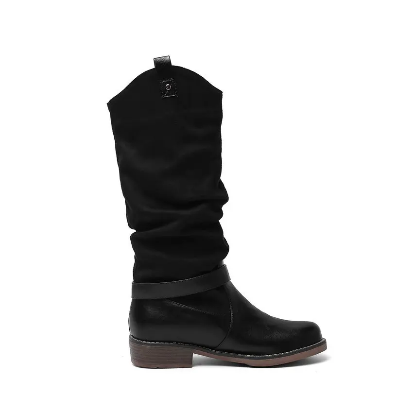 QUTAA 2020 Patchwork Flock PU Buckle Fashion Knee High Boots Casual Round Toe Slip on Winter Warm F